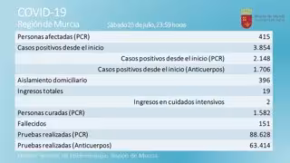 La Región de Murcia ha registrado 53 positivos nuevos por coronavirus por PCR y la cifra de activos ha ascendido hasta los 415, según el balance correspondiente a las 23.59 horas de este sábado publicado por la Consejería de Salud.