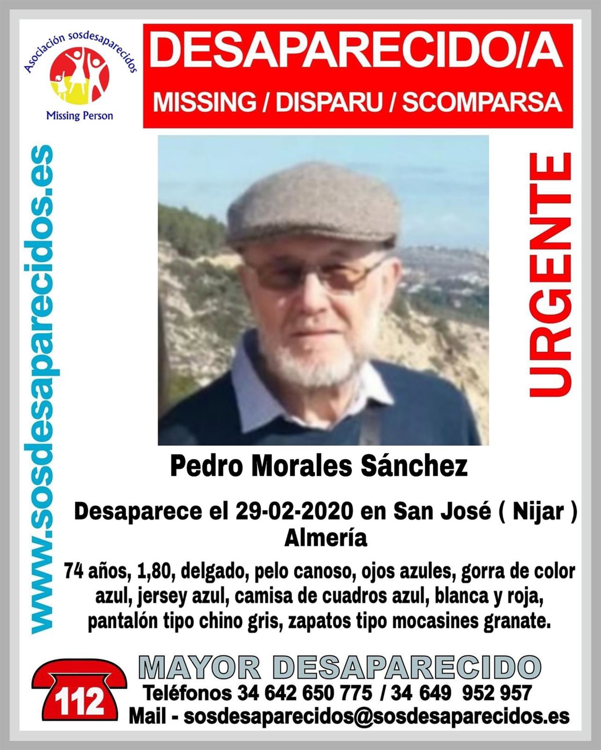 Pedro Morales Sánchez, de 74 años, residente en Cartagena, ha desaparecido en San José, localidad de Níjar perteneciente al parque natural del Cabo de Gata-Níjar.