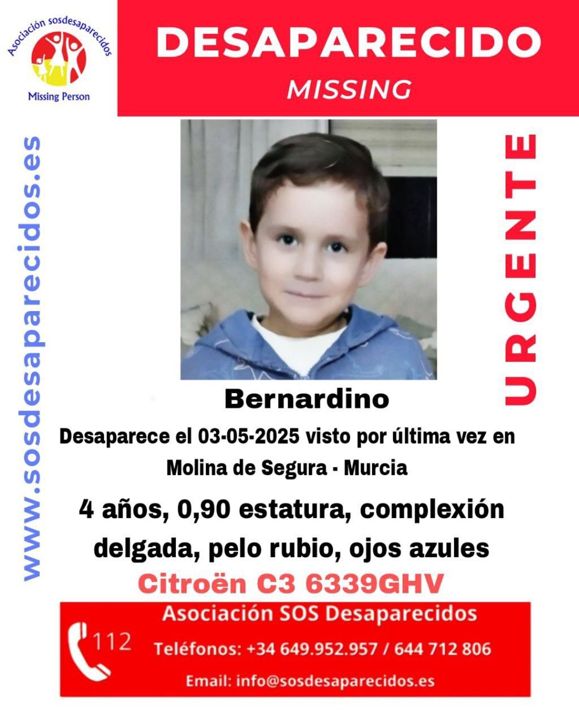 El menor tiene 4 años, es de complexión delgada y hace una semana que está en paradero desconocido. En el cartel difundido por SOS también se informa de un coche y una matrícula y pide la colaboración ciudadana para localizarlo. Se trataría de un Citroën C3 con matrícula 6339GHV.