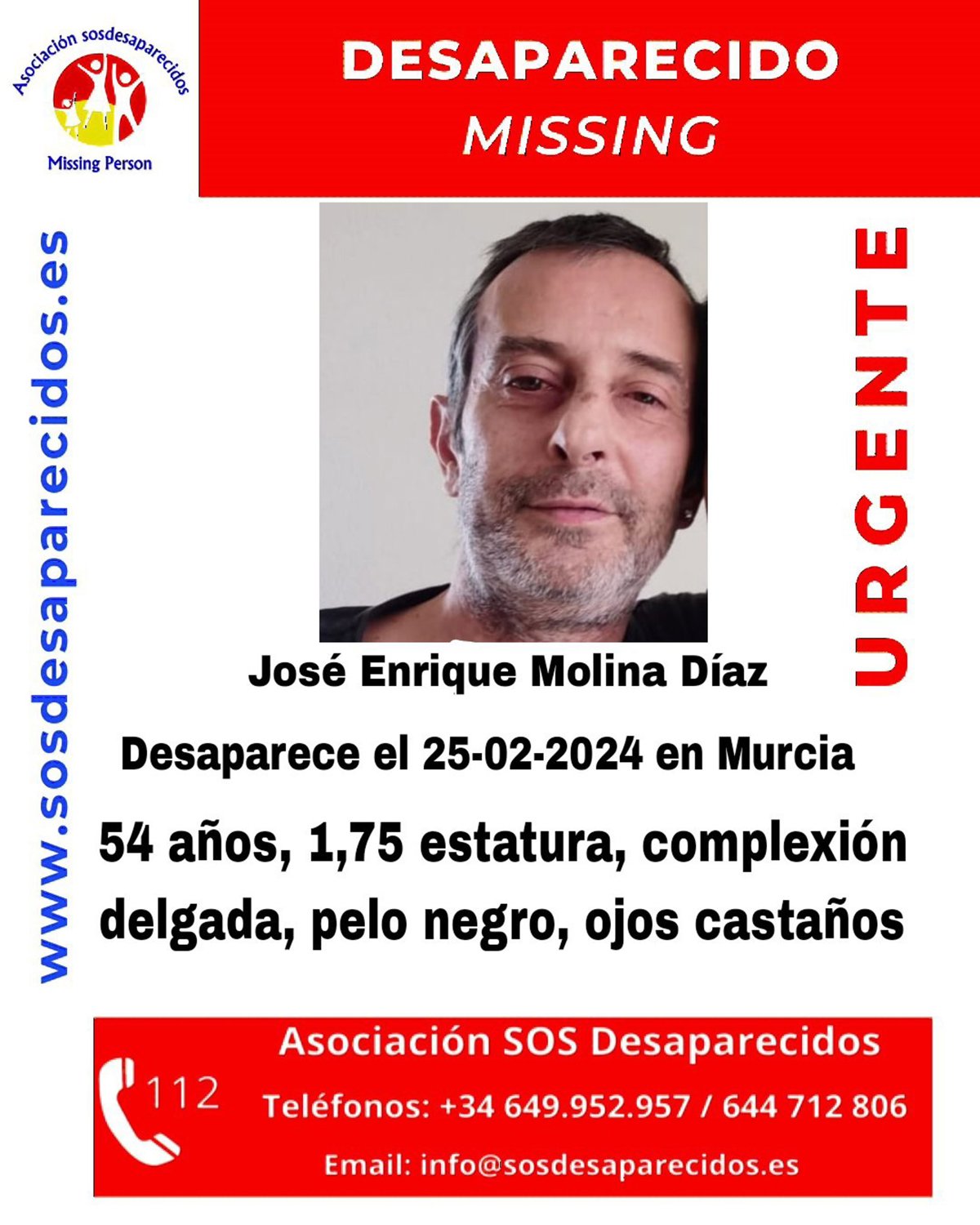 SOS Desaparecidos ha distribuido una alerta por la desaparición de un hombre de 54 años, de nombre José Enrique Molina Díaz, del que no se tienen noticias desde este domingo, 25 de febrero, cuando fue visto por última vez.