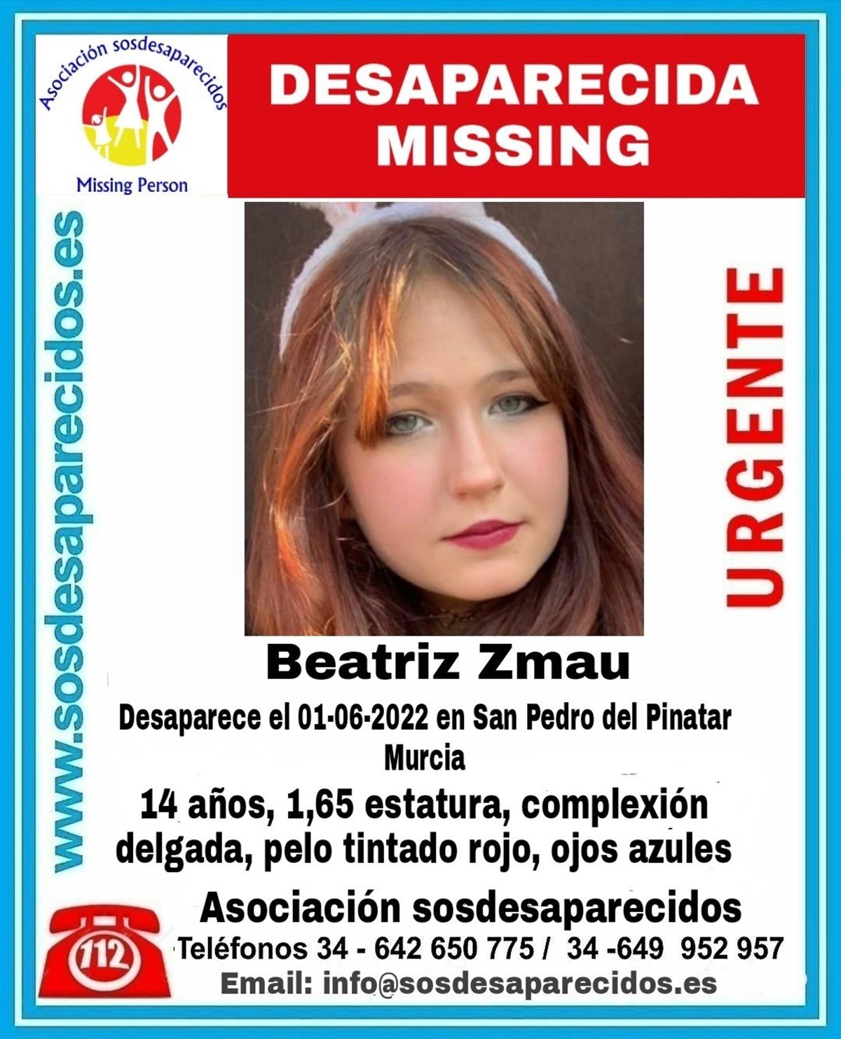 SOS Desaparecidos ha distribuido una alerta por la desaparición de una joven de 14 años, Beatriz Zmau, de la que no se tienen noticias desde hace más de dos semanas, cuando fue vista por última vez en San Pedro del Pinatar el pasado 1 de junio.