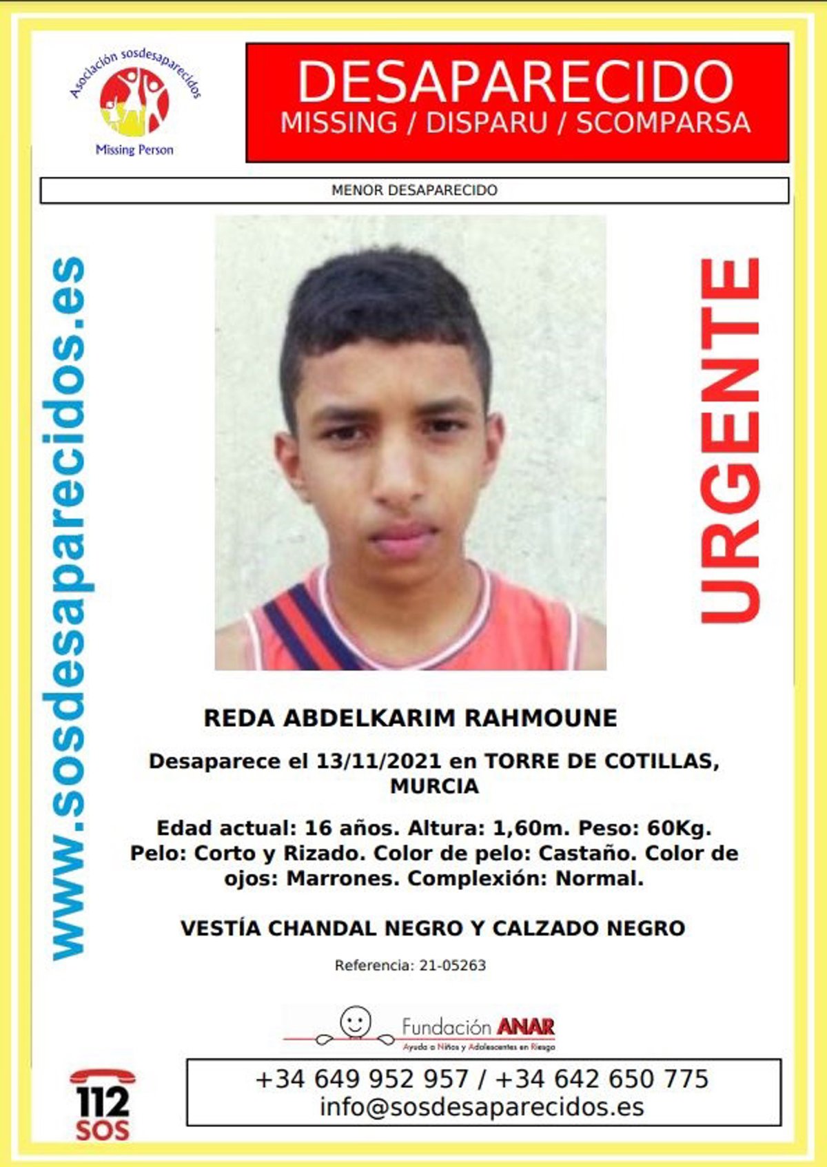 SOS Desaparecidos ha informado que un joven de 16 años, Reda Abdelkarim Rahmoune, se encuentra en paradero desconocido desde el pasado sábado 13 de noviembre, cuando fue visto por última vez en el municipio de Las Torres de Cotillas.