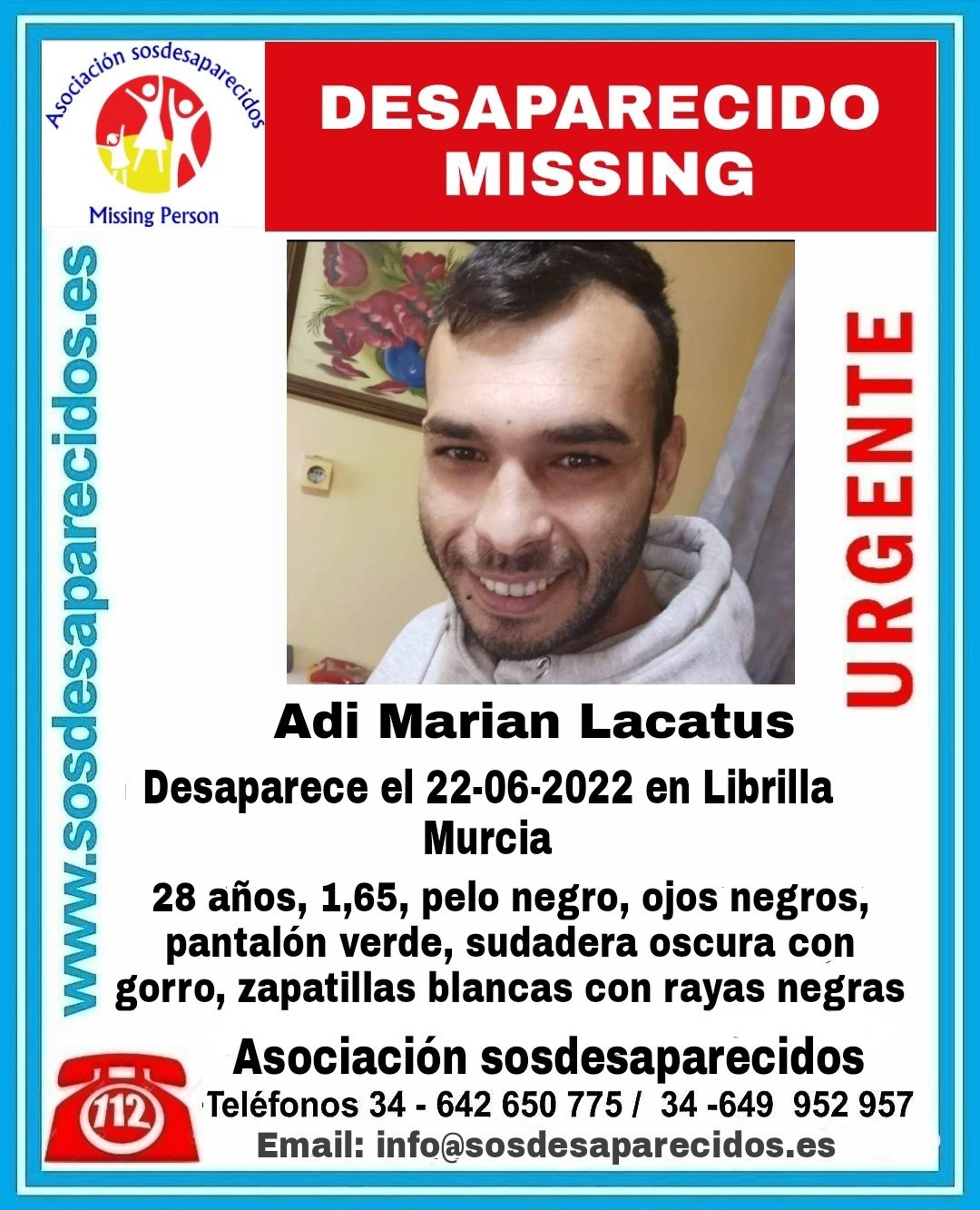 SOS Desaparecidos ha distribuido una alerta por la desaparición de un joven de 28 años, de nombre Adi Marian Lacatus, del que no se tienen noticias desde el pasado 22 de junio, cuando fue visto por última vez en Librilla (Murcia).