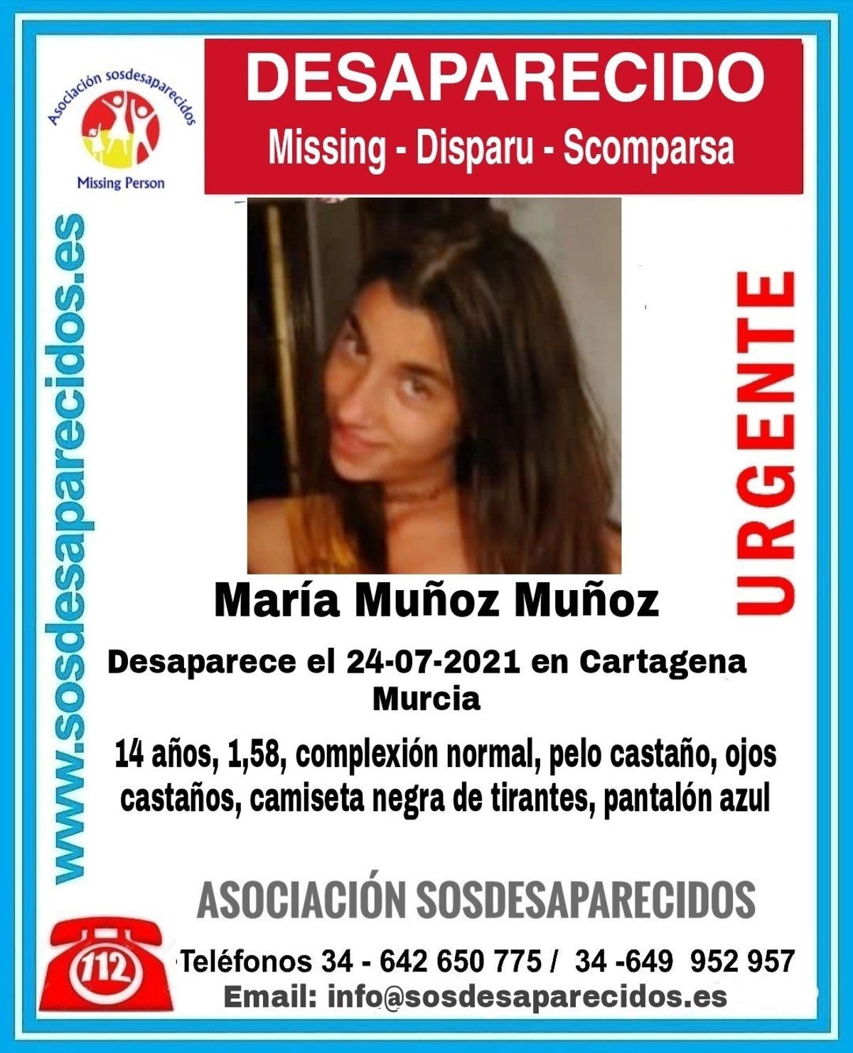 SOS Desaparecidos Región de Murcia ha informado que continúa la búsqueda de una joven de 14 años, María M.M, que se encuentra en paradero desconocido desde el pasado 24 de julio, hace ocho días, cuando fue vista por última vez en Cartagena.