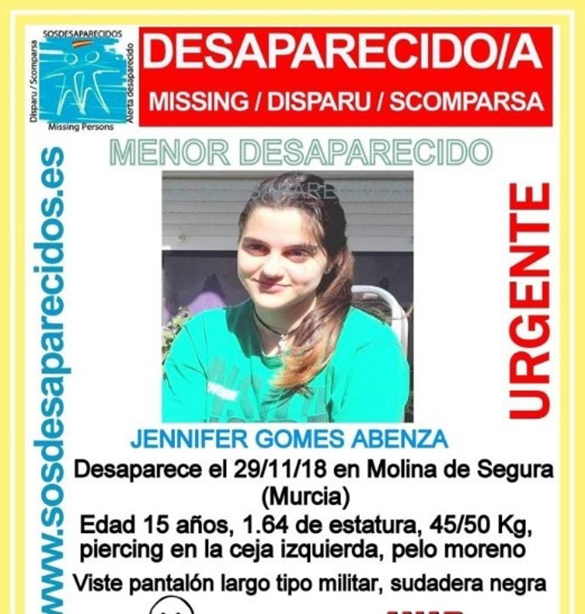 SOS Desaparecidos ha lanzado una alerta de búsqueda por la desaparición de una menor de 15 años, Jennifer Gomes Abenza, que fue vista por última vez el pasado jueves en Molina de Segura.