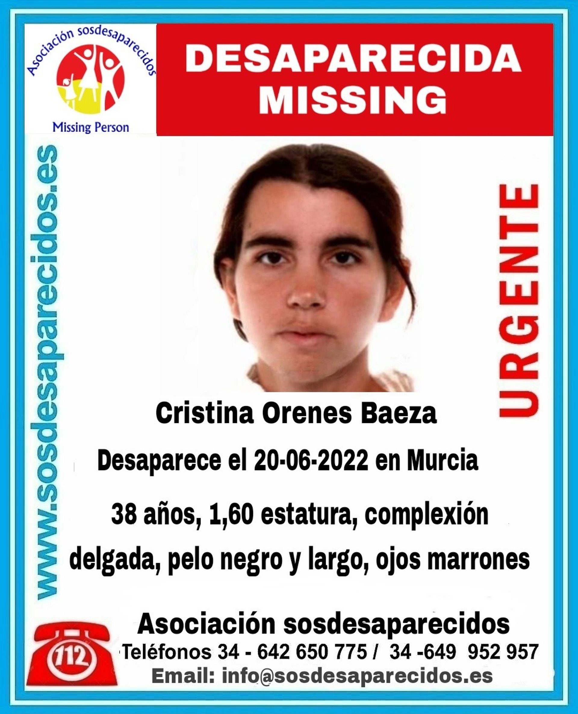 En un mensaje de Twitter recogido por Europa Press, la asociación ha detallado que se trata de Cristina Orenes Baeza. También ha adjuntado una imagen y la descripción física de la desaparecida para facilitar su identificación.
