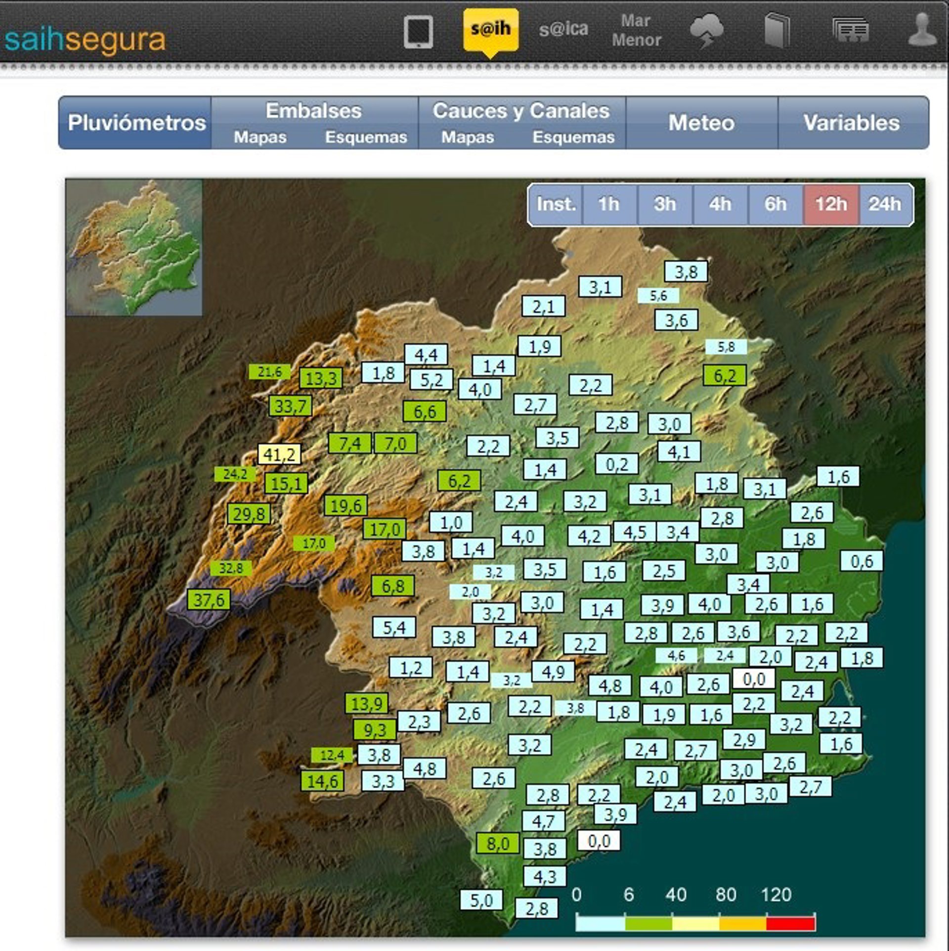 Vista del visor SAIH de la CHS sobre las lluvias caídas en las últimas 12 horas en la cuenca del Segura - CHS
