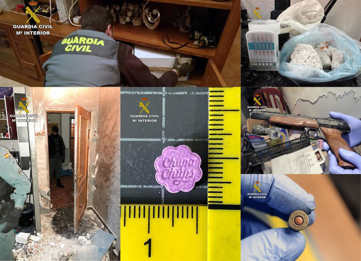 Previa autorización judicial, la Guardia Civil ha efectuado la entrada y el registro de seis inmuebles en los que se ha incautado gran cantidad de drogas, como 508 dosis de cocaína y 114 de heroína, 1,1 kilos de metanfetamina, 1,7 kilos de marihuana, 27 pastillas de éxtasis y 1,2 kilos de sustancia de corte, y diversos elementos utilizados para su manipulación y distribución.