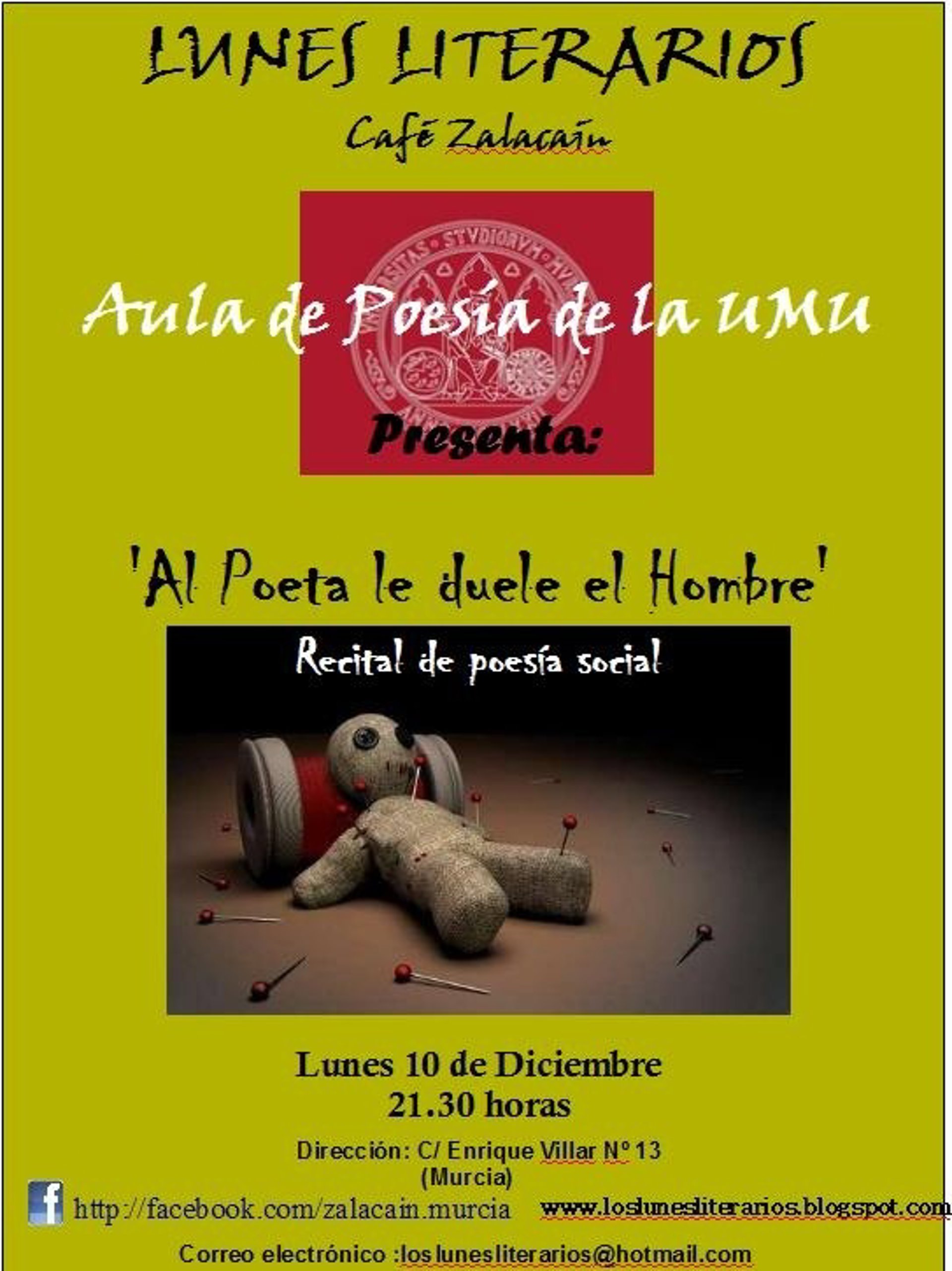 El Café Zalacaín de Murcia acoge este lunes, a partir de las 21.30 horas, la II Edición de 'A poeta le duele el hombre', un recital de poesía social organizado por el Aula de Poesía de la Universidad de Murcia (UMU) en colaboración con el ciclo de los 'Lunes Literarios'.