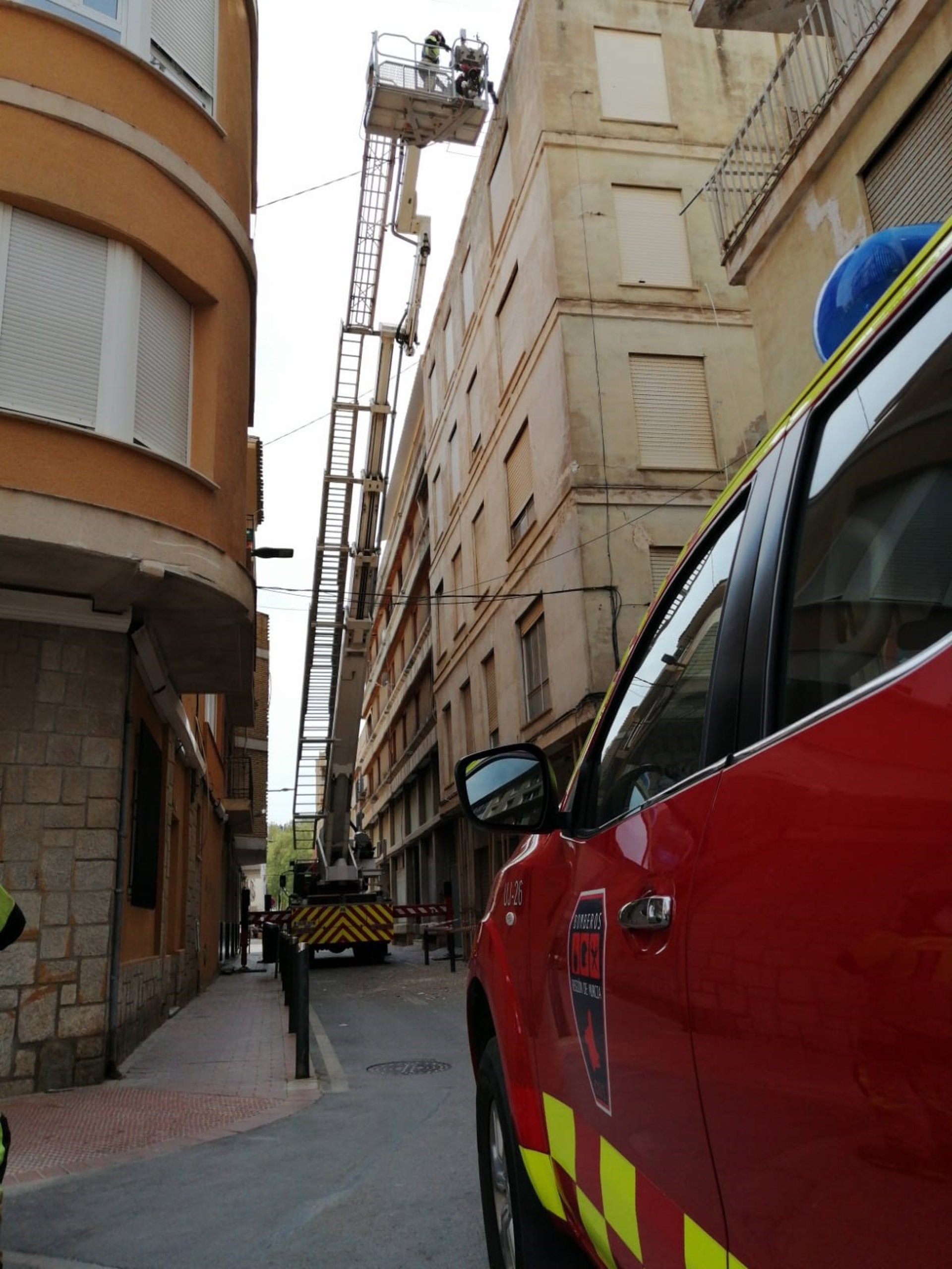 Efectivos del Consorcio de Extinción de Incendios y Salvamento (CEIS) de la Región de Murcia han revisado la fachada de un edificio de cuatro plantas de la travesía Ramón y Cajal de Lorca ante la caída de cascotes a la vía pública.