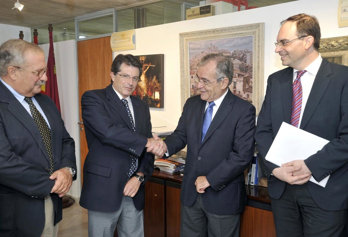 El director general de Cajamurcia, Federico Ros, ha entregado la recaudación de la cuenta solidaria al alcalde de Lorca, Francisco Jódar, en presencia del vicepresidente de Cajamurcia, Manuel Jódar y del gerente de la Fundación Cajamurcia, Pascual Martínez.