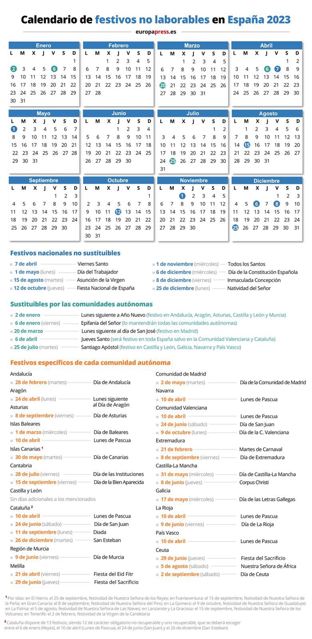 Archivo - Calendario de festivos no laborables en España 2023 - Europa Press - Archivo