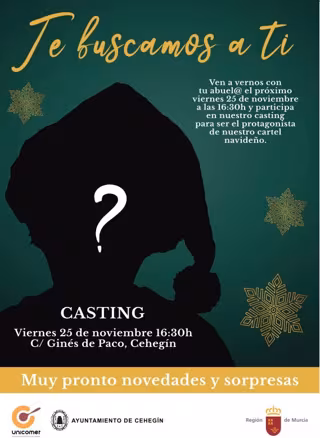 Bajo el slogan '¡Te buscamos a ti!' se convoca a todos los abuelos/as de la localidad -y a sus nietos- a un casting para elegir al abuelo/a que aparecerá en el cartel anunciador de la citada campaña. Será el próximo viernes, 25 de noviembre, a las 16.30 horas en la calle Ginés de Paco.