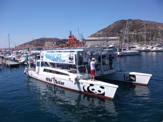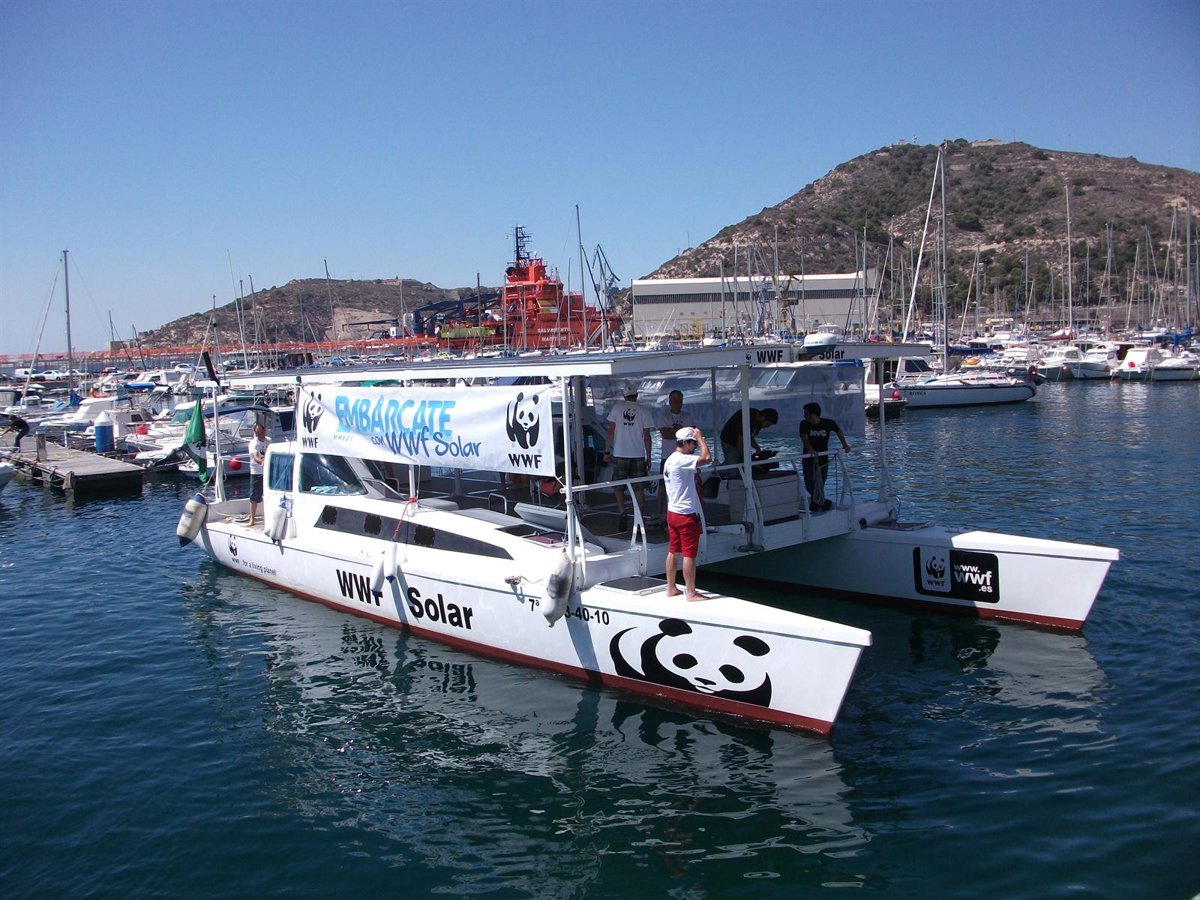 El barco solar de WWF, que estará atracado en Cartagena hasta el domingo inclusive, es un catamarán de 14 metros de eslora, con capacidad para 12 personas. Posee dos motores eléctricos y una autonomía de 18 horas sin sol.