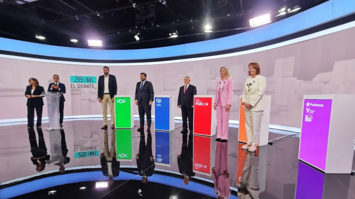 En la primera parte del debate han participado Fernando López Miras (Partido Popular), José Vélez (PSOE), María José Ros (Ciudadanos), José Ángel Antelo (Vox) y María Marín (Podemos en coalición con Izquierda Unida-Verdes y Alianza Verde), quien, al llegar el momento de dejar su sitio a Helena Vidal (Más Región en coalición con Equo) se ha negado y se ha tenido que suspender.