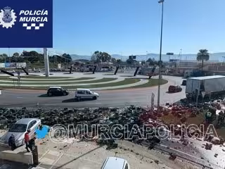 Imagen del camión y de la carga esparcida en la rotonda - POLICÍA LOCAL DE MURCIA