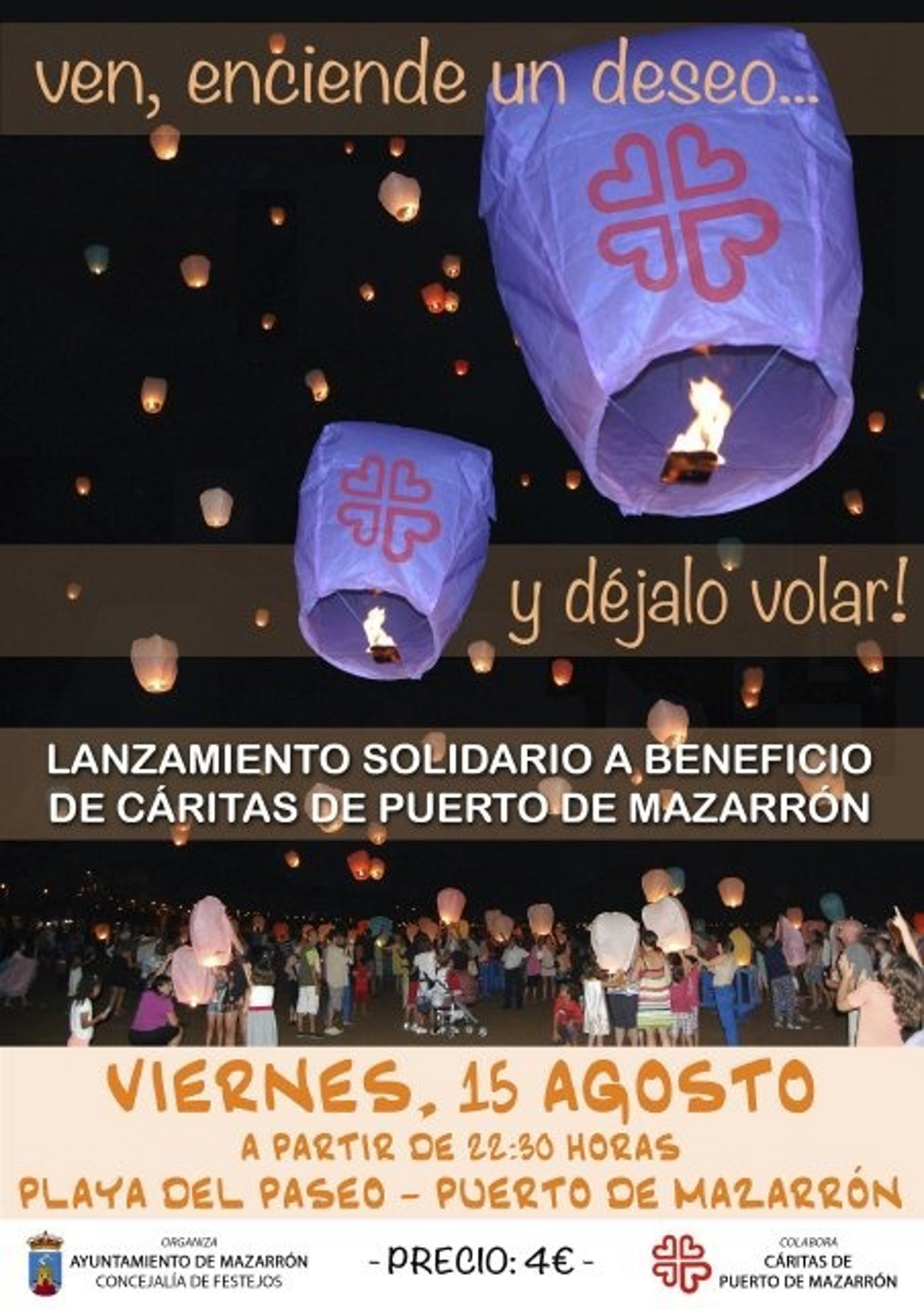 Por segundo año consecutivo y tras el éxito de la edición anterior, Cáritas y la Concejalía de Festejos del Ayuntamiento de Mazarrón vuelven a organizar este viernes, a las 22.30 horas, un lanzamiento solidario de farolillos desde la playa del Puerto, junto al Paseo de las Comunidades Autónomas.
