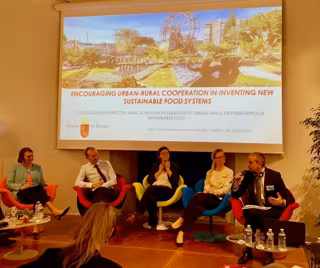 Pleguezuelo intervino como ponente para explicar las políticas aplicadas por la Región de Murcia en materia de alianzas entre zonas urbanas y rurales en favor de una alimentación sostenible. La mayor parte de su ponencia se centró en el plan de consumo de frutas y hortalizas en los centros escolares de la Comunidad.