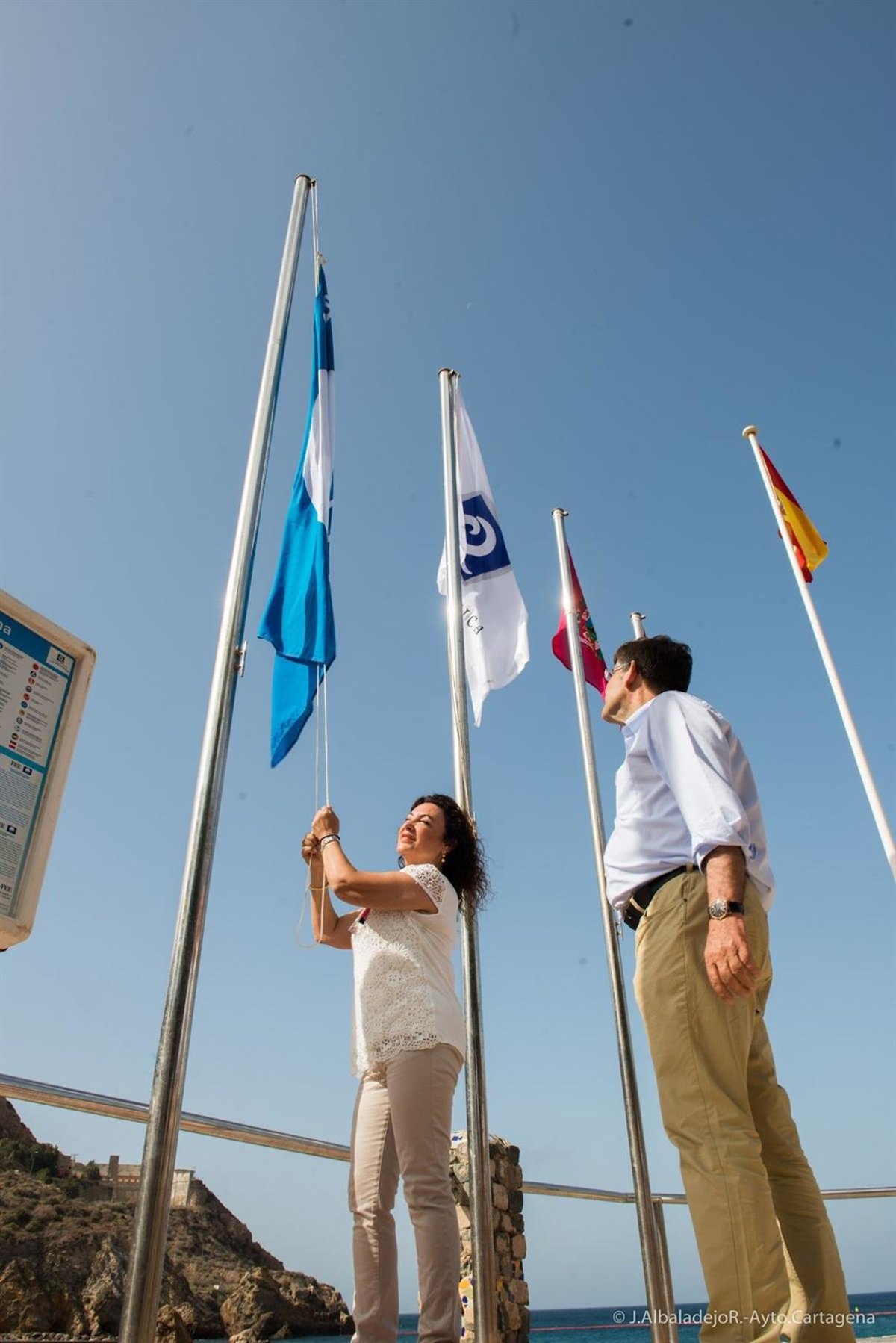 La playa urbana de Cala Cortina ha sido el lugar escogido para realizar el acto simbólico de izado de banderas azules y de 'Q' de calidad que han concedido este año al municipio de Cartagena. Con un total de 11 banderas, la ciudad portuaria se consolida así como el municipio con más banderas azules del país, compartiendo honor con la localidad gallega de Sanxenxo.