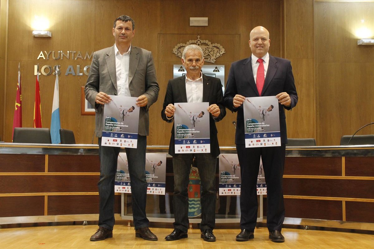 El concejal de Deportes del Ayuntamiento de Los Alcázares, Francisco Montesinos, el director General de Juventud y Deportes, Antonio Peñalver y el director del Servicio de Deportes de la UCAM, Pablo Rosique, han presentado este martes los Campeonatos de España Universitarios de Taekwondo, Bádminton y Kárate que se celebran en el Centro de Alto Rendimiento de Los Alcázares desde el 25 de abril al 9 de mayo.