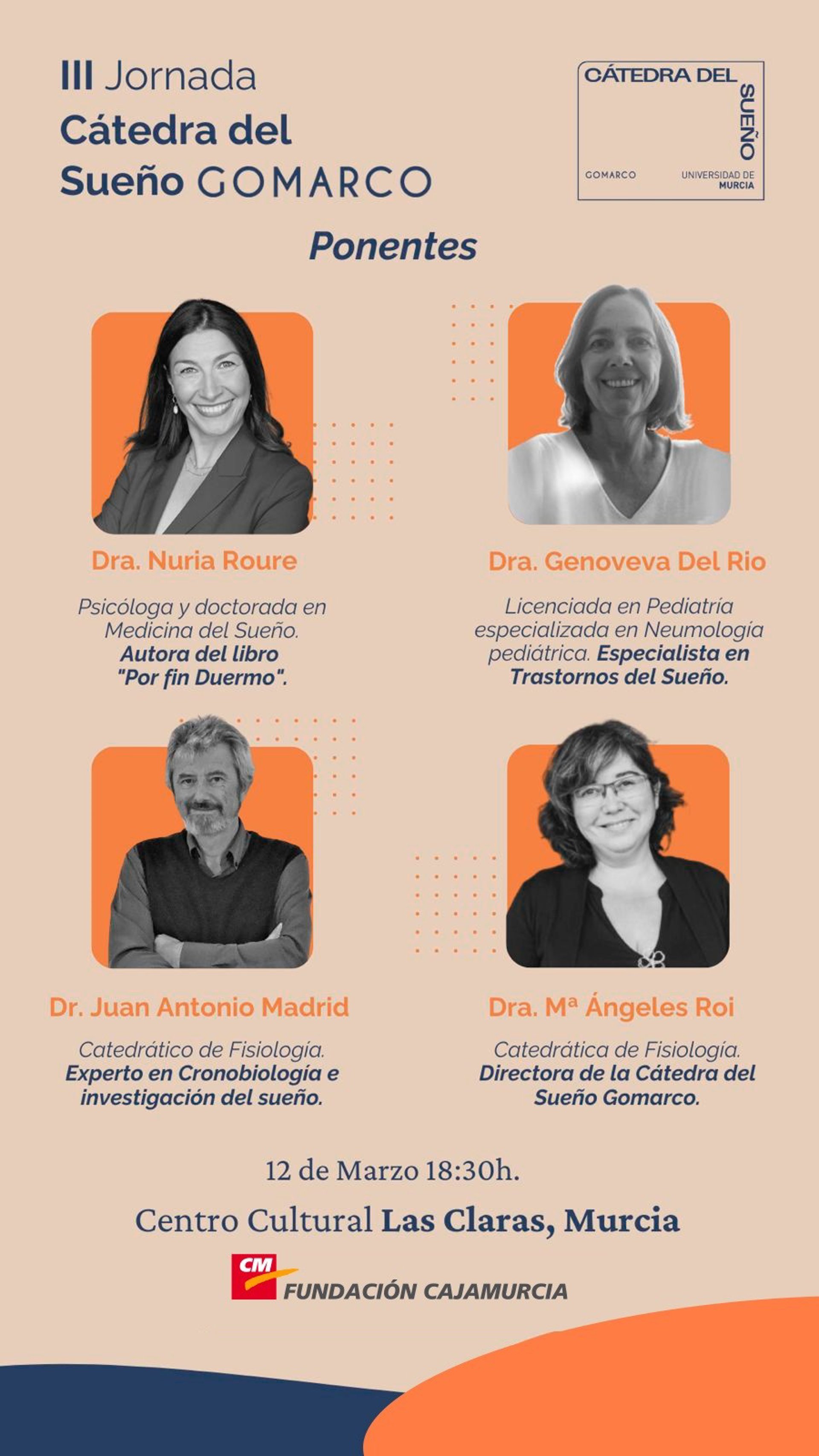 La Cátedra del Sueño Gomarco de la Universidad de Murcia (UMU) celebra este miércoles, 12 de marzo, sus terceras jornadas de formación y divulgación, sobre calidad del sueño, en las que participan los especialistas Nuria Roure, Genoveva del Río, Juan Antonio Madrid y María ángeles Rol.