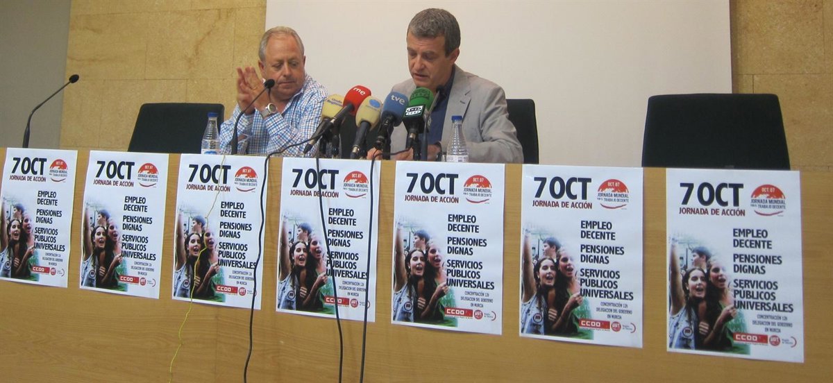 Así lo ha hecho saber el secretario general de CCOO Región de Murcia, Daniel Bueno, quien ha comparecido junto a su homólogo en UGT, Antonio Jiménez, con motivo de la Jornada Mundial por el Trabajo Decente, "que adquiere una fuerza reivindicativa en el conjunto de la Región y del país para denunciar el deterioro permanente que está sufriendo el trabajo en la sociedad".