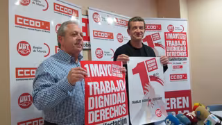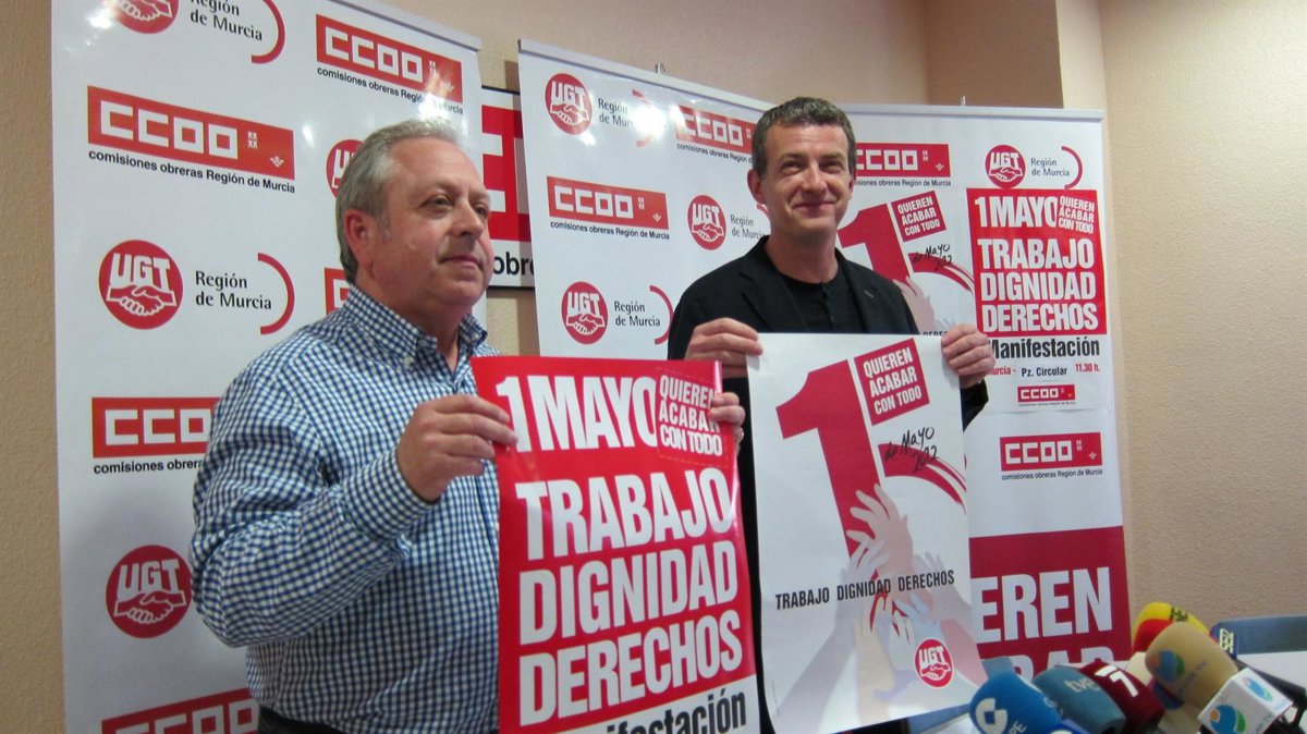 Los secretarios generales de UGT, Antonio Jiménez, y CCOO, Daniel Bueno, llaman al conjunto de la ciudadanía para que participen en la manifestación de este martes, 1 de mayo, Día Internacional del Trabajo, en rechazo a las nuevas políticas de recortes efectuadas por el Gobierno de Mariano Rajoy, "en la necesidad de un cambio de las políticas públicas" y en defensa del modelo social y por el empleo.