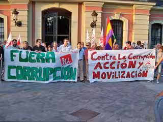 De este modo, la concentración, organizada por Izquierda Unida, ha estado presidida por dos pancartas, una portada por militantes de IU con el lema 'Fuera corrupción', y otra por miembros de las Juventudes Comunistas de la Región de Murcia, en la que se leía 'Contra la acción y la corrupción: acción y movilización'.