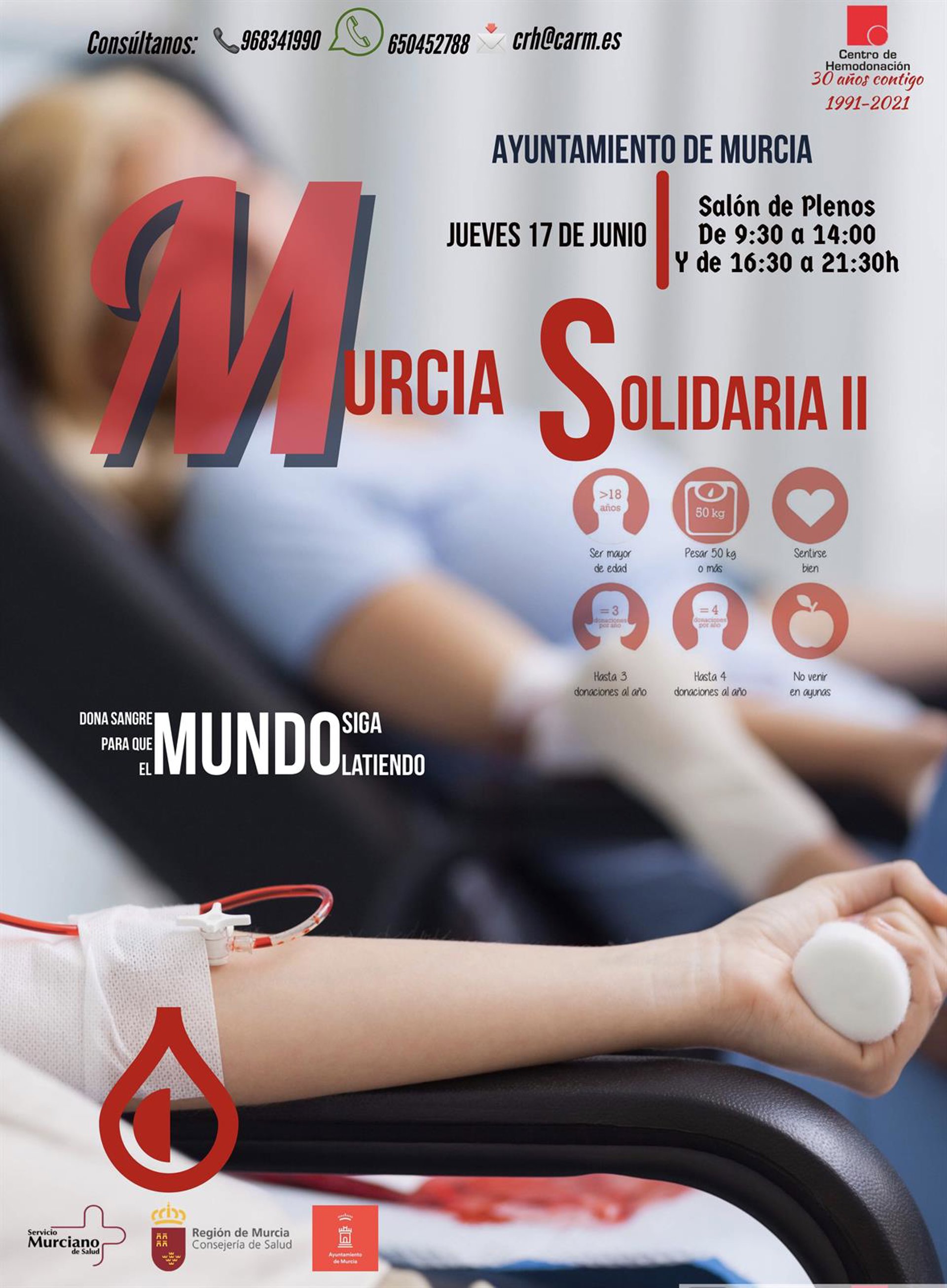 Por ello, ha hecho un llamamiento a la solidaridad de la población para que este jueves acuda al maratón de donación que celebra el Ayuntamiento de Murcia, con motivo del 30 aniversario del Centro Regional de Hemodonación y el Día Mundial del Donante.