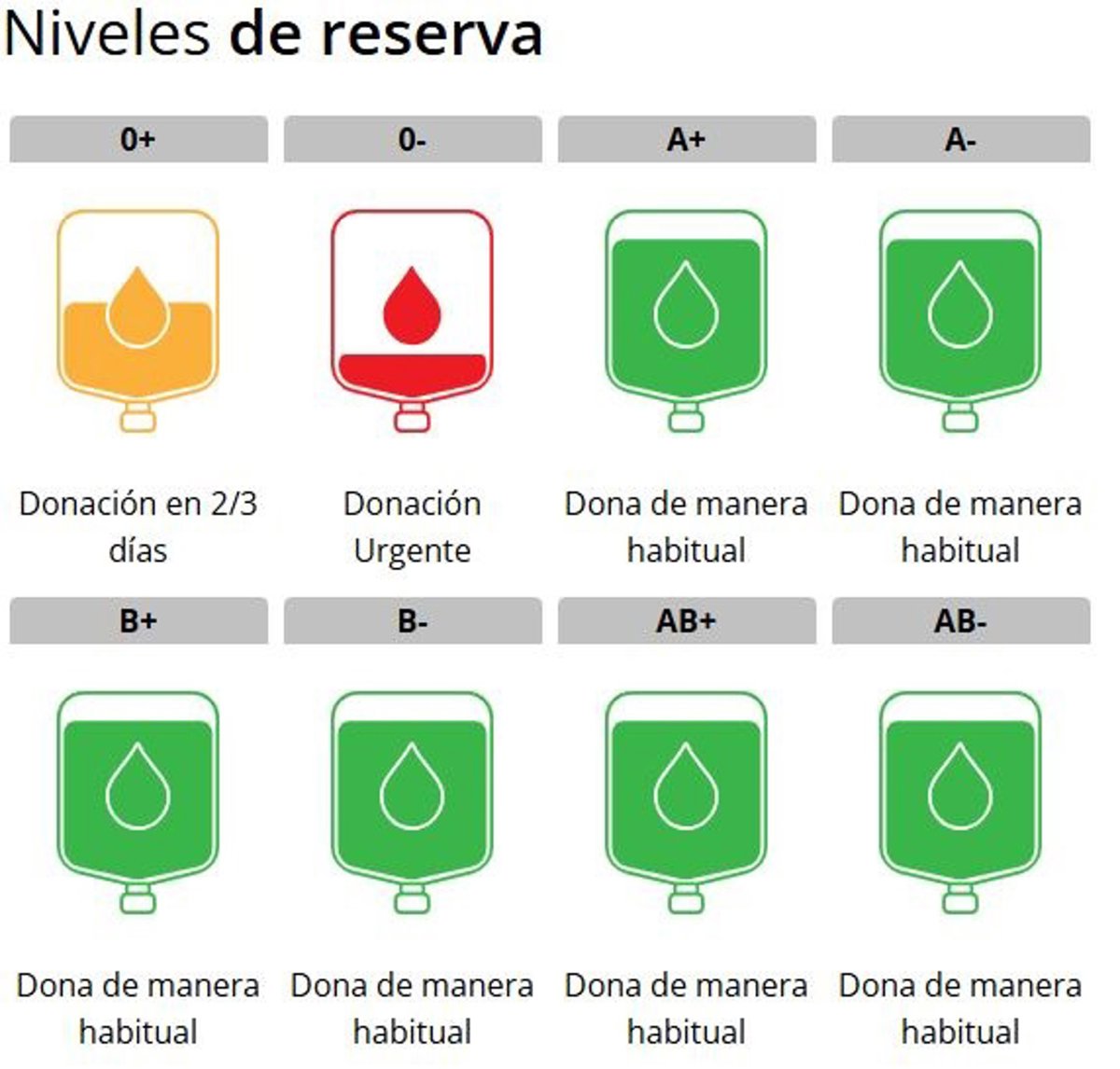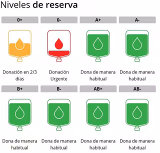 En concreto, el Centro apunta que los niveles de sangre son más críticos en el caso del 0-, por lo que llama a donar sangre de este tipo de forma urgente; mientras que los donantes de 0+ pueden hacerlo en 2 o 3 días y los del resto de manera habitual.