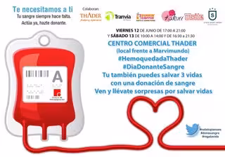 El Centro Regional de Hemodonación, dependiente del Servicio Murciano de Salud (SMS) de la Consejería de Sanidad y Política Social, ha organizado una '#Hemoquedada' para este viernes, 12 de junio, de las 17.00 a las 21.00 horas, y para el sábado, 13 de junio, de 10.00 a 14.00 horas y de 16.30 a 21.00 horas, en el Centro Comercial Thader, en Murcia.