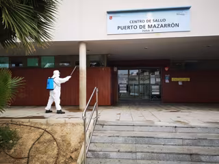 Un operario fumiga en la puerta del centro de salud de Mazarrón - AYUNTAMIENTO DE MAZARRÓN - Archivo