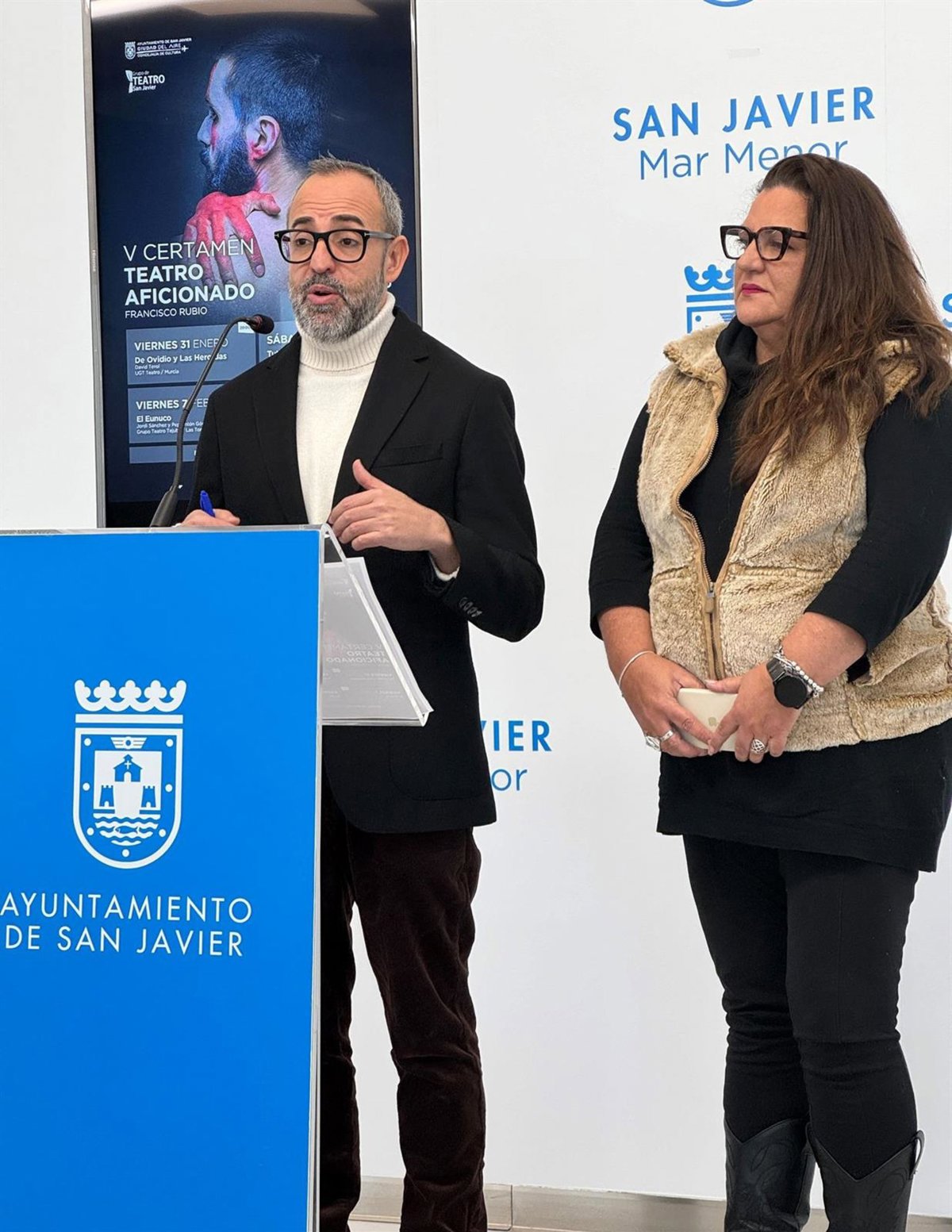El concejal de Cultura, David Martínez y la presidenta del Grupo de Teatro de San Javier, Catalina Jiménez, han presentado esta mañana el Certamen que por primera vez se celebrará en el Teatro de Invierno, de San Javier, organizado, también por primera vez, por el Grupo de Teatro San Javier, con la colaboración de la concejalía de Cultura, que cede al grupo de teatro aficionado local un mayor protagonismo en el Festival.
