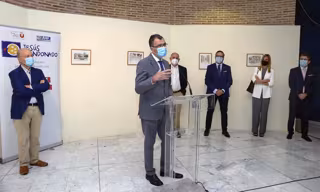 El salón de actos de la Cámara de Comercio de Murcia ha acogido este lunes la presentación de la exposición 'Murcia confinada', un conjunto de acuarelas de César Oliva que muestran las calles de la ciudad durante esos meses, informaron fuentes municipales en un comunicado.