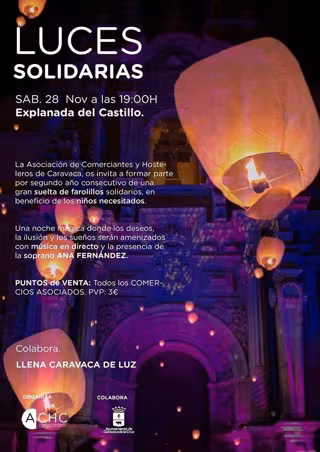 La actividad 'Luces Solidarias', que promueve la Asociación de Comerciantes y Hosteleros de Caravaca (ACHC) con el apoyo de la Concejalía de Comercio de Caravaca, tendrá lugar este sábado, 28 de noviembre, a las 19.00 horas, en la explanada del Castillo.