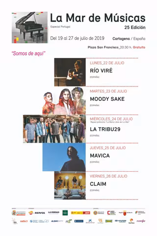 El escenario 'Somos de Aquí' en la plaza San Francisco de Cartagena será el espacio que dará voz a las bandas y artistas de la Región de Murcia que participan en la 25 edición de La Mar de Músicas y que presentarán sus últimos trabajos al público de Cartagena. Entre el lunes 22 y el viernes 26 de julio actuarán Río Viré, Moody Sake, La Tribu29, Mavica y Claim. Todos los conciertos serán a las 20.30 horas y gratuitos.