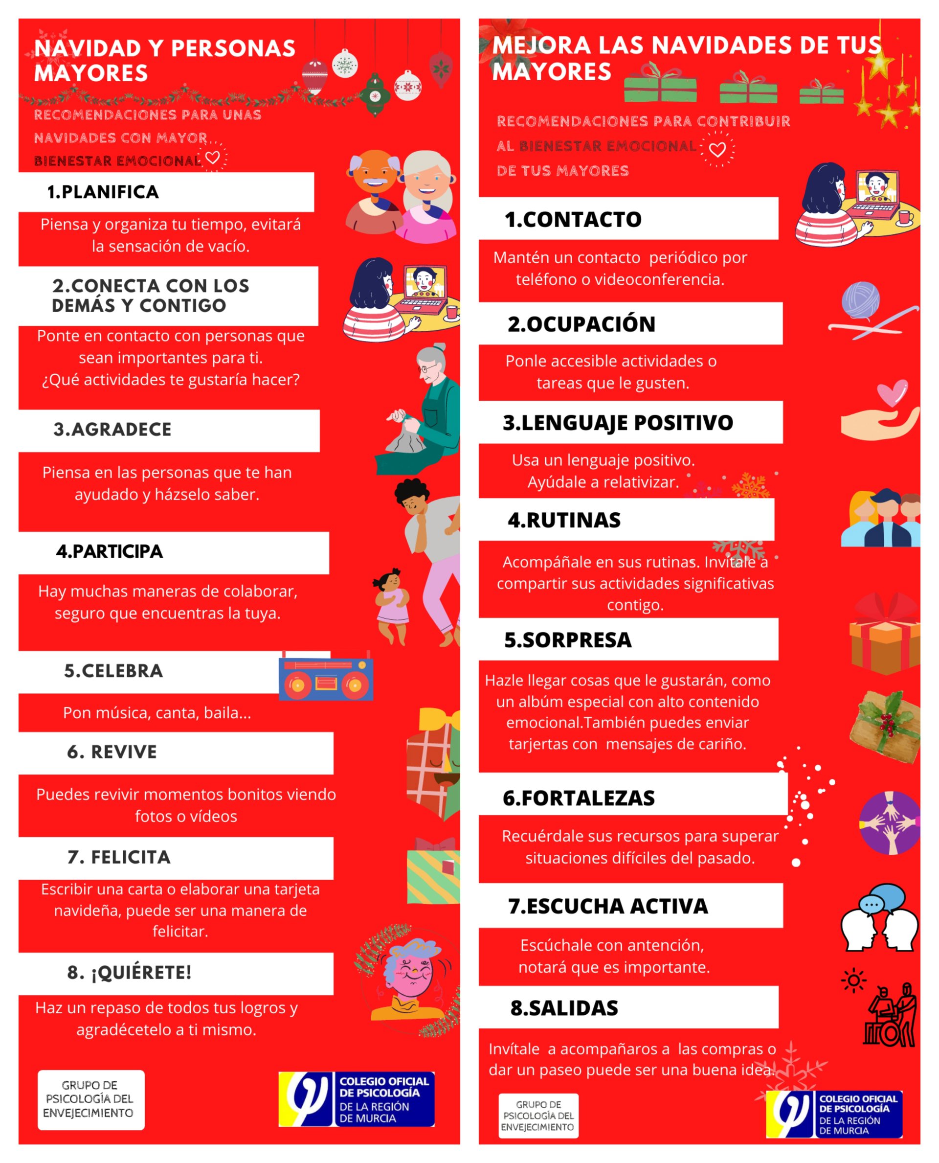 En este sentido, el Grupo de Envejecimiento del Colegio de Psicólogos de Murcia ha elaborado también una serie de recomendaciones dirigidas a las propias personas mayores para sobrellevar mejor las fiestas.