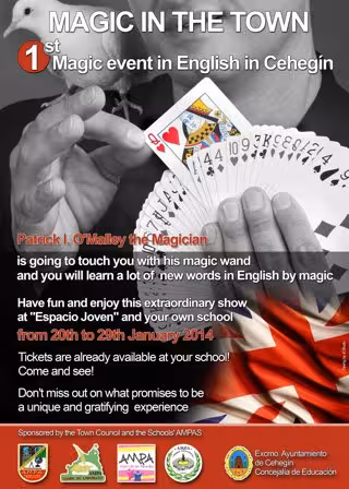 Los centros educativos de Cehegín, con el patrocinio de las AMPAS y el Ayuntamiento de la localidad, presentan 'Magia en Inglés', una experiencia única e innovadora, "cuya finalidad es potenciar el aprendizaje del idioma a través de una sesión de magia, conducida exclusivamente en inglés. Sin lugar a dudas, captará la atención de los niños e incrementará el grado de comprensión oral y la motivación por el aprendizaje del idioma", según ha manifestado el concejal de Educación, Nicolás del Toro.