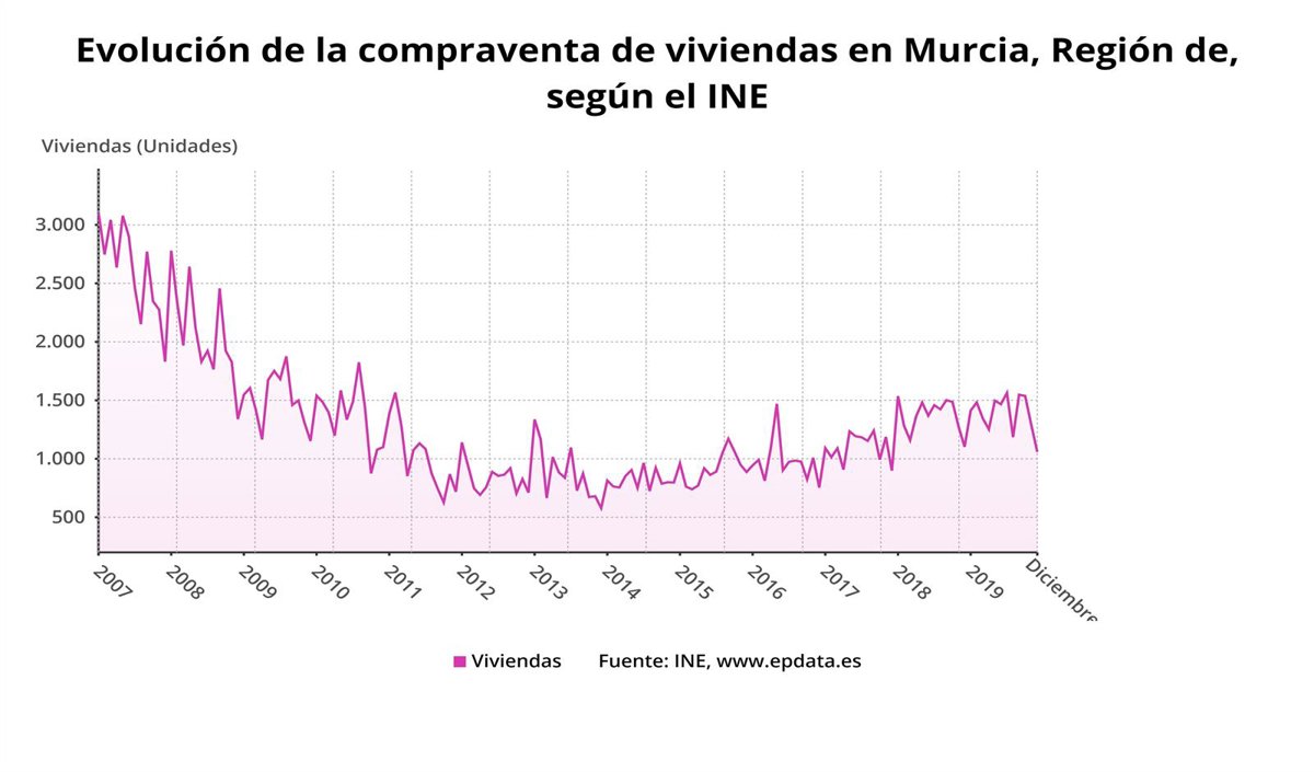 En diciembre, la compraventa de viviendas en la Región de Murcia descendió un 3,9 por ciento respecto al mismo mes del año anterior, hasta las 1.059 operaciones, mientras que en el conjunto nacional aumentó un 1,8 por ciento. Se trata de la tercera mayor caída por comunidades.