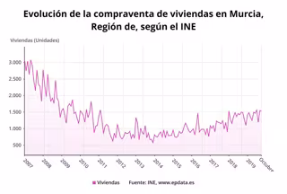 La compraventa de viviendas en la Región de Murcia en el mes de octubre aumentó un 3,4 por ciento respecto al mismo mes del año anterior, hasta las 1.537 operaciones, mientras que en el conjunto nacional cayó un 1,5 por ciento. Se trata del sexto menor aumento por comunidades, según datos publicados este viernes por el Instituto Nacional de Estadística (INE).
