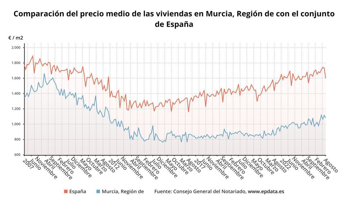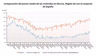Comparación del precio medio de las viviendas en la Región de Murcia con el conjunto de España - EPDATA