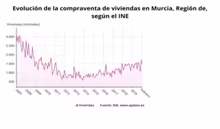 La compraventa de viviendas en la Región de Murcia en el mes de febrero aumentó un 3 por ciento respecto al mismo mes del año anterior, hasta las 1.497 operaciones, frente al ascenso del 0,1 por ciento de la media nacional. Se trata del séptimo mayor crecimiento en España por comunidades, según datos publicados este lunes por el Instituto Nacional de Estadística (INE).