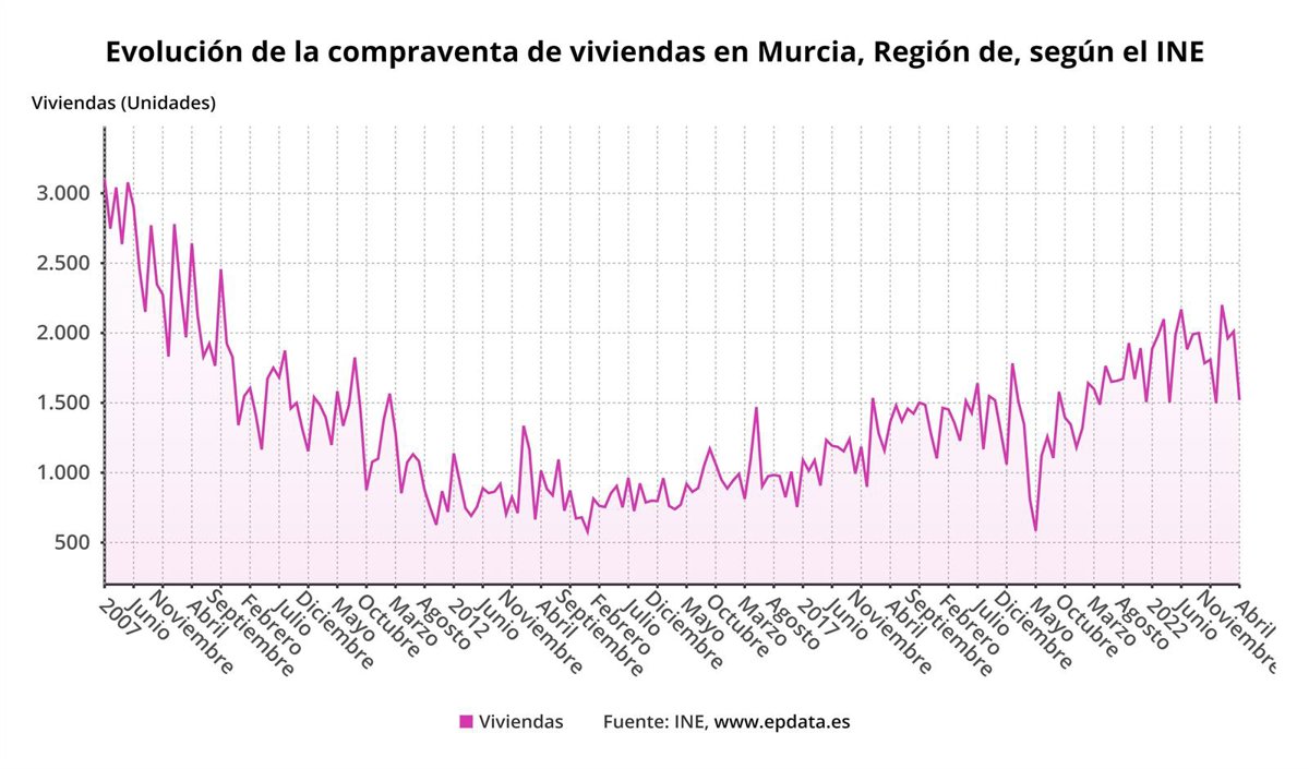 La compraventa de viviendas en la Región de Murcia aumentó un 1,2% en abril en comparación con el mismo mes de 2022, hasta las 1.520 operaciones, según datos que publica este lunes el Instituto Nacional de Estadística (INE).