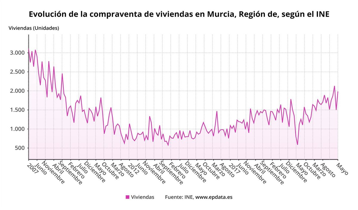La compraventa de viviendas en la Región de Murcia en el mes de mayo aumentó un 12,6 por ciento respecto al mismo mes del año anterior, hasta las 1.986 operaciones, inferior a la subida del 27,7 por ciento de la media nacional. Se trata del decimoquinto mayor crecimiento registrado en España por comunidades, según datos publicados este viernes por el Instituto Nacional de Estadística (INE).