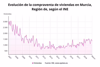 La compraventa de viviendas en la Región de Murcia en el mes de marzo aumentó un 16,1 por ciento respecto al mismo mes del año anterior, hasta las 1.346 operaciones, superior al incremento medio de España, que subió un 6,8 por ciento y el quinto mayor crecimiento de España por comunidades, según datos publicados este martes por el Instituto Nacional de Estadística (INE).