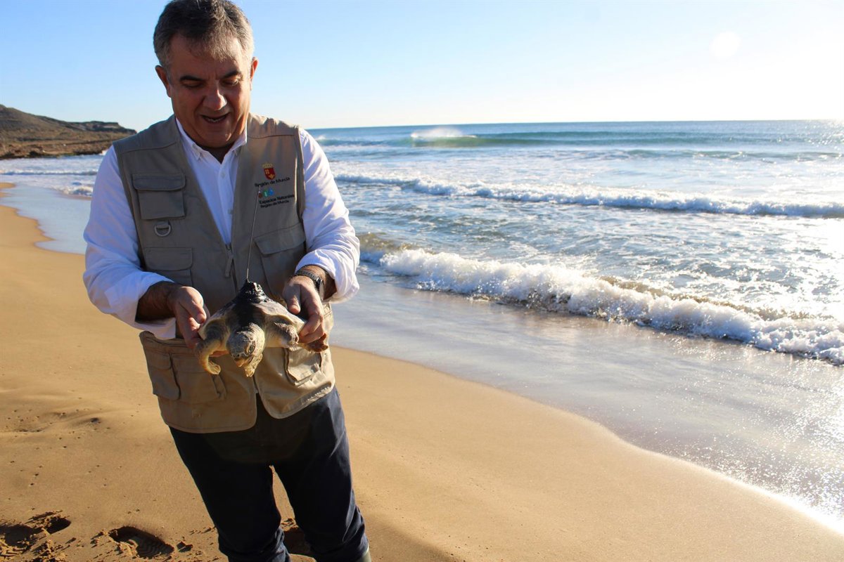 El consejero de Medio Ambiente, Universidades, Investigación y Mar Menor, Juan María Vázquez, pone en libertad una tortuga boba que ha sido tratada en el Centro de Recuperación de Fauna Silvestre El Valle - CARM