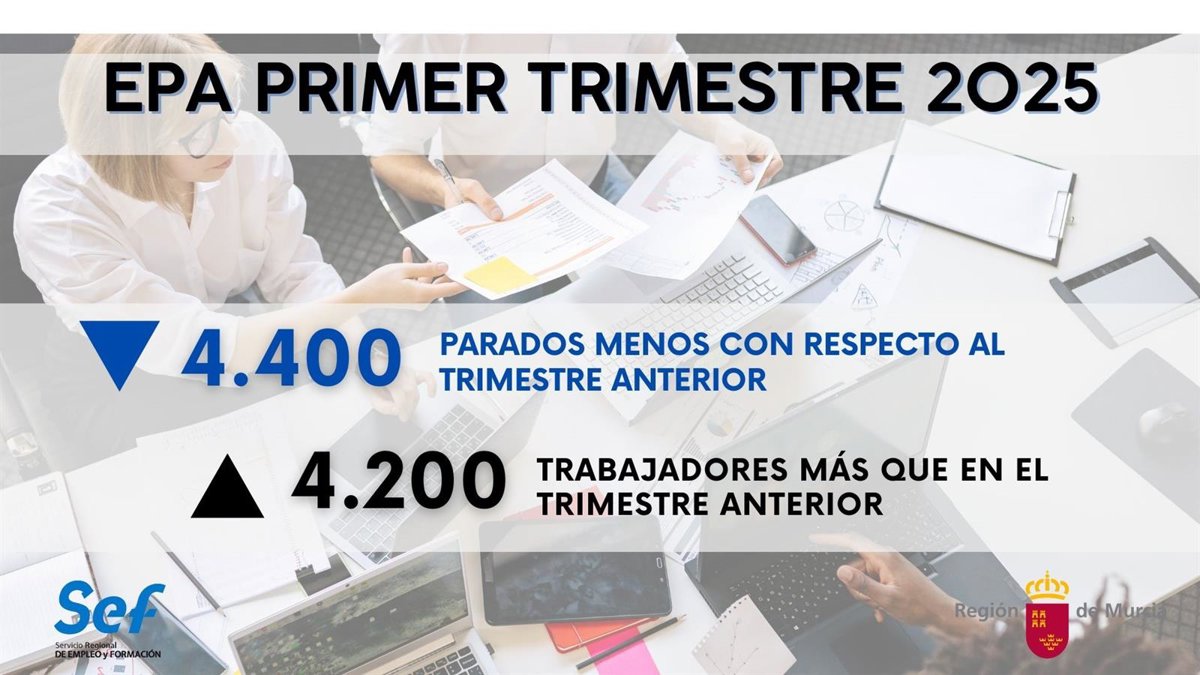 Según la EPA, la Región de Murcia cerró el primer trimestre del año con 4.400 personas desempleadas menos y 4.200 trabajadores más con respecto al mismo periodo anterior. En concreto, entre enero y marzo, el paro cayó un 4,27 por ciento, mientras que la ocupación creció un 0,63 por ciento.