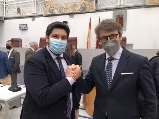 El presidente de la Región de Murcia, Fernando López Miras, estrecha la mano del consejero de Economía, Hacienda y Administración Digital, Luis Alberto Marín - CARM