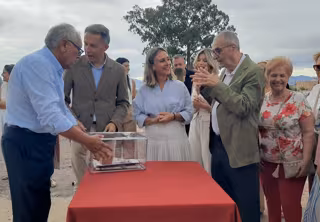 La consejera de Política Social, Familias e Igualdad, Conchita Ruiz, junto con el alcalde de Lorca, Fulgencio Gil, y el presidente de Apandis, Antonio Bastida, ha participado en el acto de colocación de la primera piedra de este conjunto residencial, que ha sido diseñado bajo un modelo de atención integral centrado en la persona y en su libertad para poder elegir cómo y con quién quieren vivir.