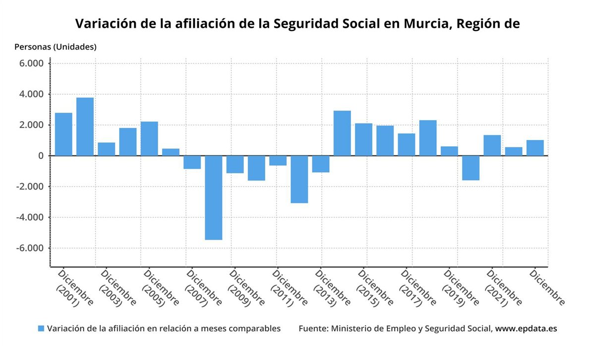 La Región de Murcia ha cerrado 2023 con 646.333 afiliados a la Seguridad Social tras sumar en términos interanuales un total de 14.498 (+2,29%) respecto al último mes del año anterior, según ha informado este miércoles el Ministerio de Inclusión, Seguridad Social y Migraciones.